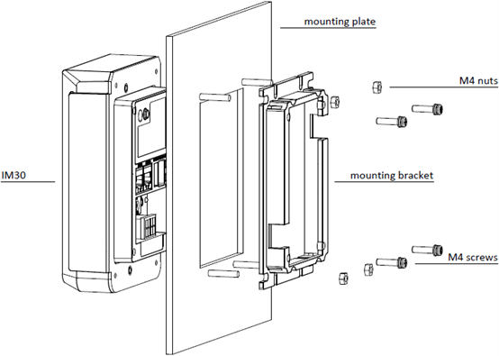 - If the mounting plate is ≤ 4mm thick, apply a torque of 0.6 ~ 0.8 Nm to the four M4 screws included with your IM30 unit to secure the IM30 to the mounting bracket. If the mounting plate is more than 4mm thick, obtain M4 screws with the following thread length and use them instead: (mounting plate thickness + 10mm) ≤ thread length ≤ (mounting plate thickness + 14mm)