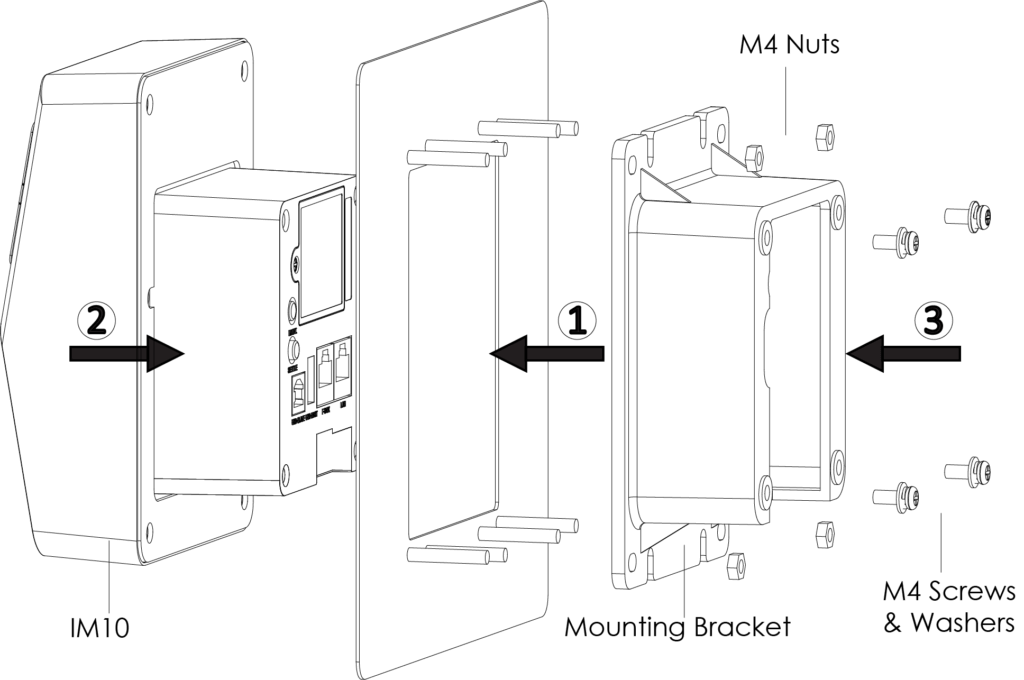 - Secure the IM10 unit to its mounting bracket using 4 screws and washers.