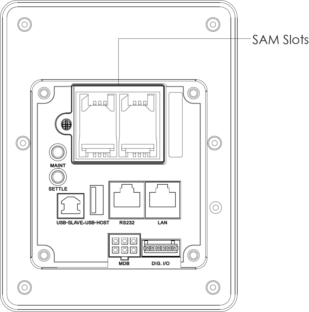 - Unscrew the SAM card module cover to reveal the SAM card slots (2).