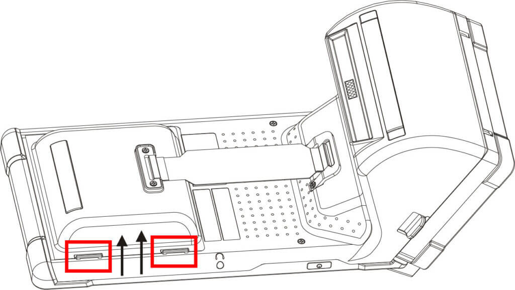 - Hold the sides of E600, and push further the button in direction shown below to open battery cover.