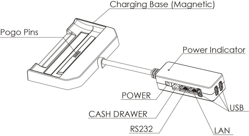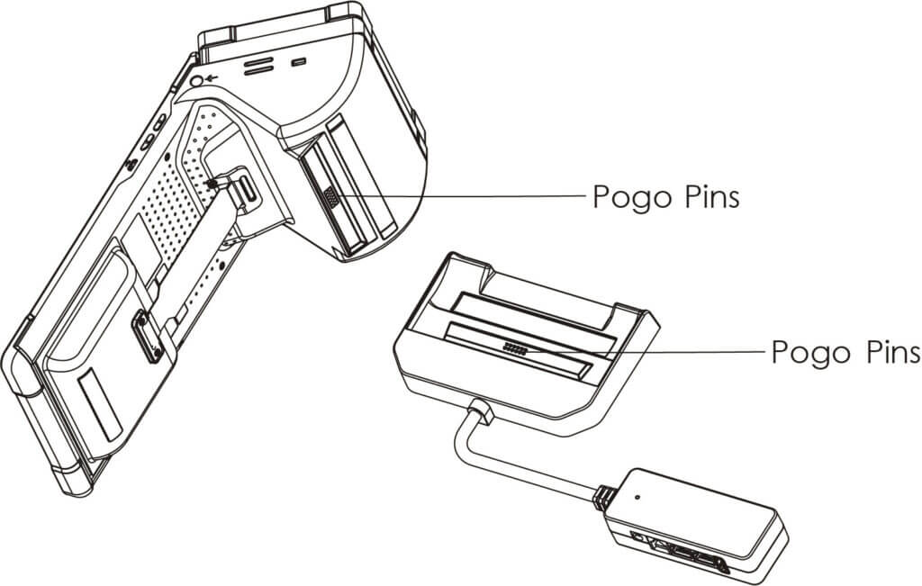 - Align the charging pins on the back of the E600 with the POGO Pins on the charging base.