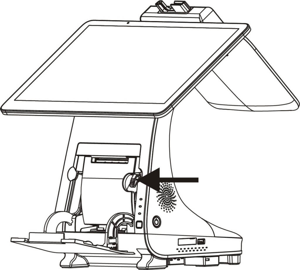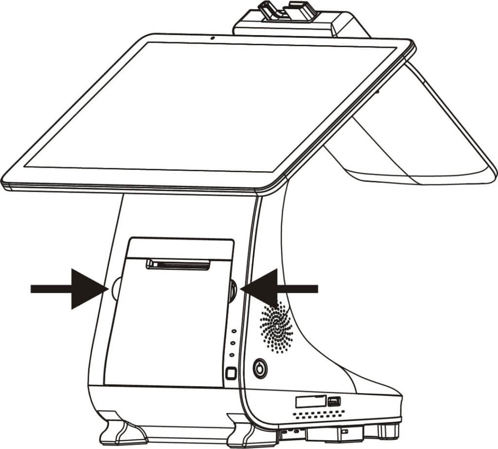 1. When the printer is out of paper, the yellow “Paper Out” indicator lights. Press the button on the left of printer to open the cover.