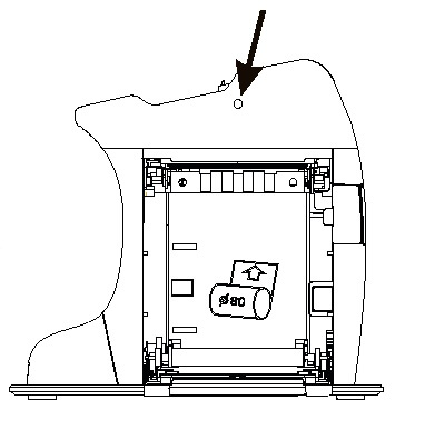- Put the paper roll (width: 58mm, diameter: 80 mm) into the paper holder with the paper coming from the top of the roll and pull about a 6” length of receipt paper and close the paper door. Tear off excess receipt paper.