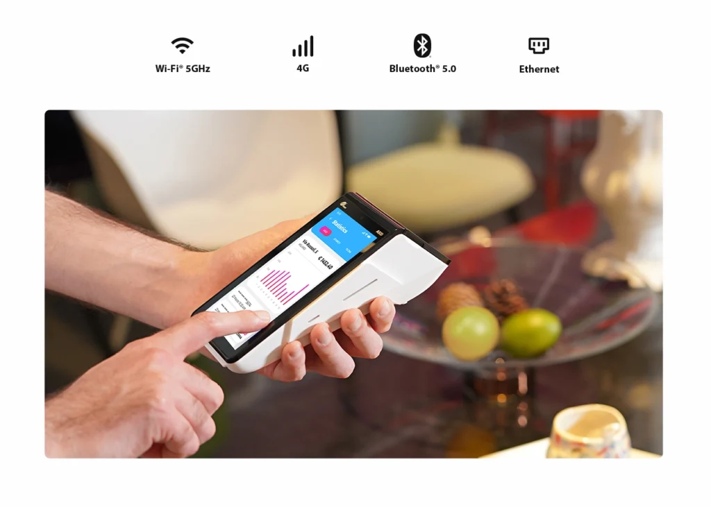 With built-in Wi-Fi, Bluetooth, and Ethernet, the A800 ensures fast, flexible, and reliable connectivity in any environment. Whether you’re on the counter or on the move, it keeps your business seamlessly online.