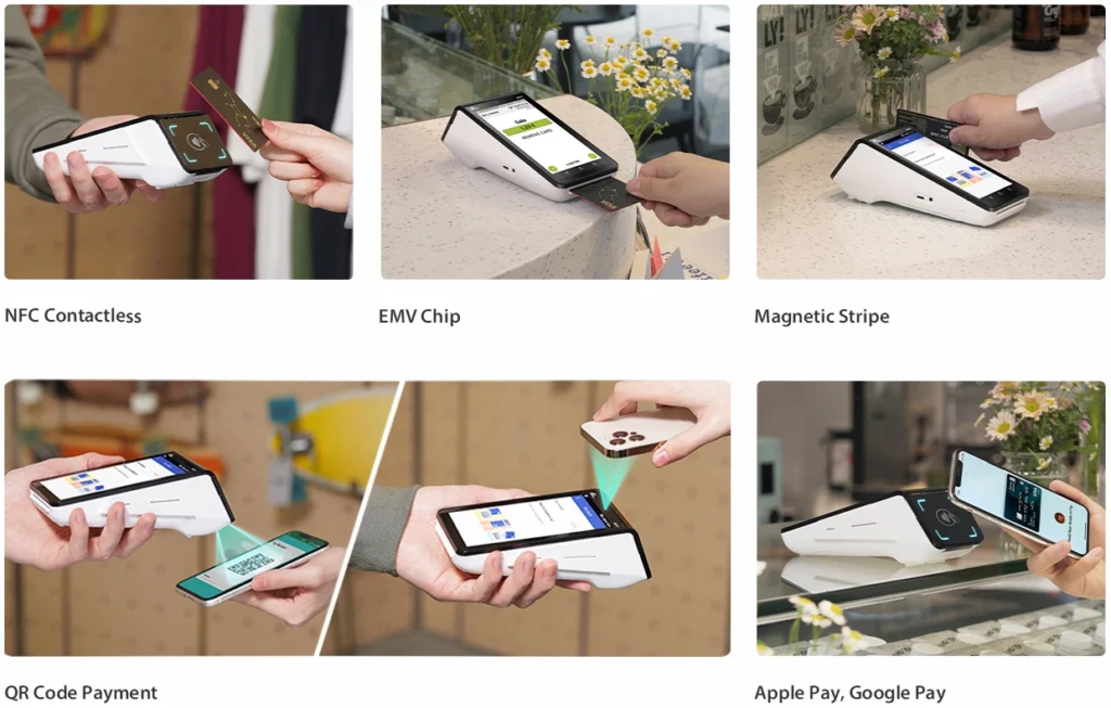 The A800 supports multiple payment methods, including EMV chip and PIN, magnetic stripe (MSR), NFC/contactless payments, and mobile wallets, accommodating many customer preferences.