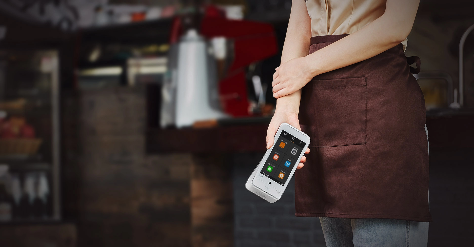 The device features a sleek, curved body that fits comfortably in the hand, making it easy for merchants to carry and operate throughout the day. Its lightweight design and intuitive touchscreen layout enhance usability, reducing strain during prolonged use and improving overall efficiency at the point of sale.