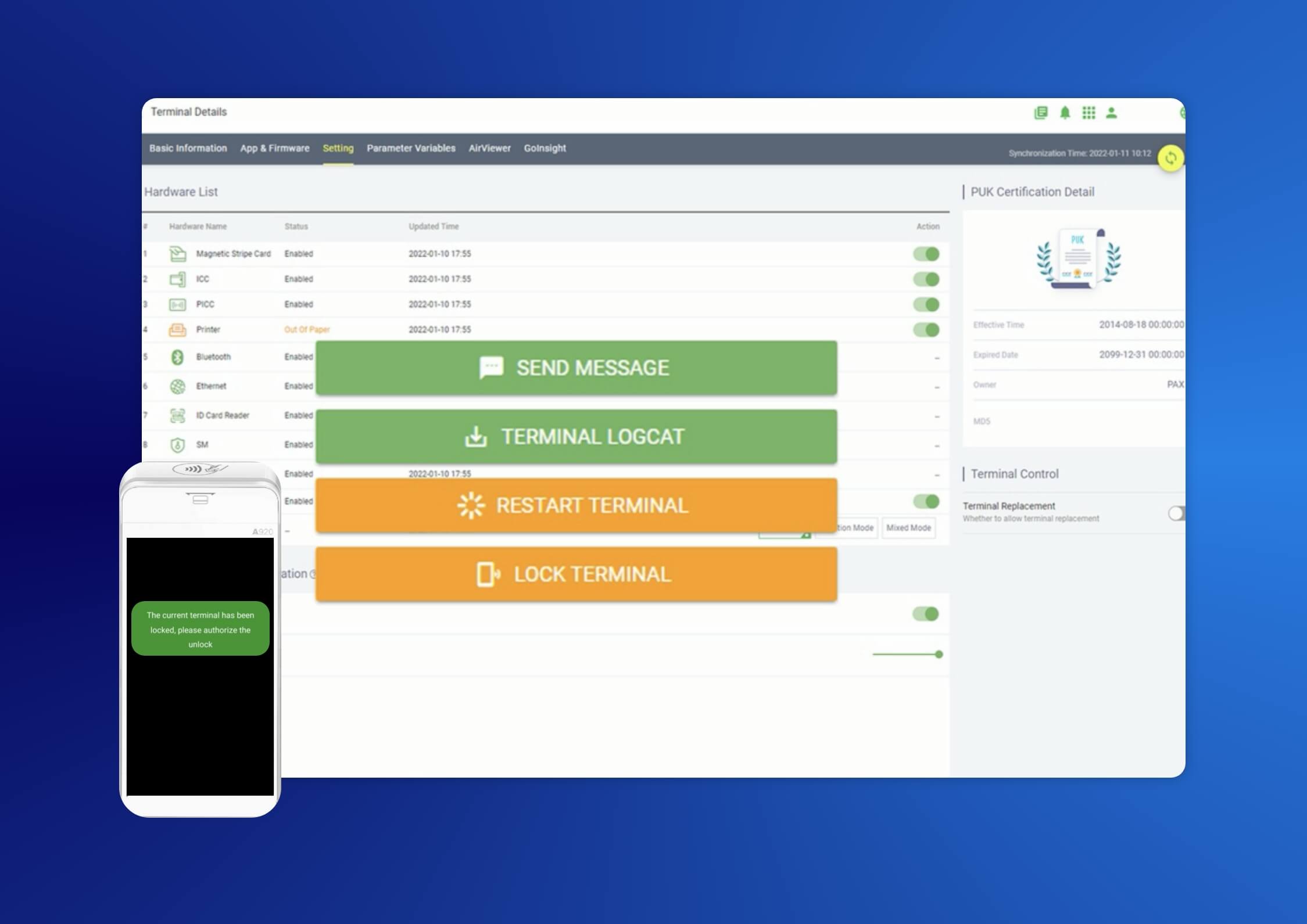 For premium marketplace accounts, the merchant can choose to lock their terminals. Once the Android terminal is back in range or in its owner’s possession, users can easily unlock the device through PAXSTORE Marketplace to perform transactions.